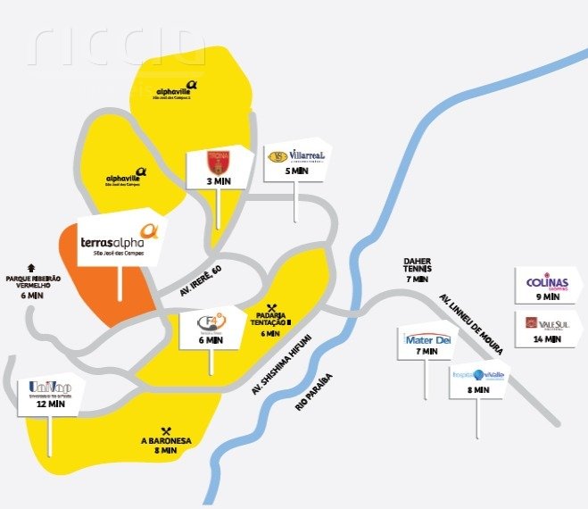 Dentre os condomínios próximos ao Condominio Terras Alpha Urbanova, podemos destacar o Condominio Alphaville - Fase 1 , Condominio Reserva do Paratehy , Condominio Residencial Jaguary , Condominio Colinas do Paratehy , Condomínio Alphaville - Fase 2 e Condomínio Jardins Das Nações Urbanova .