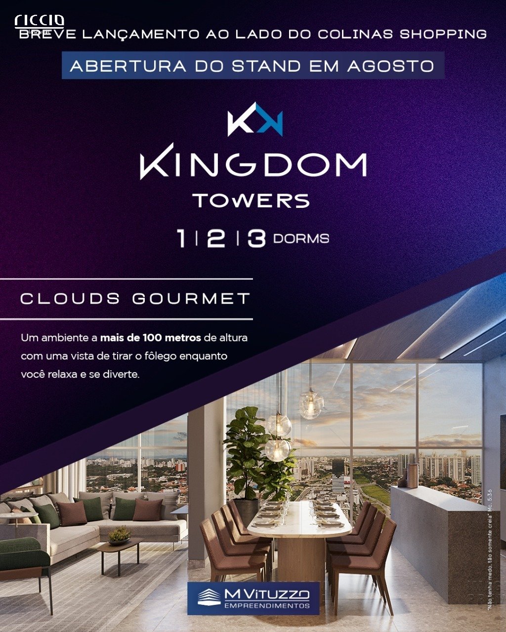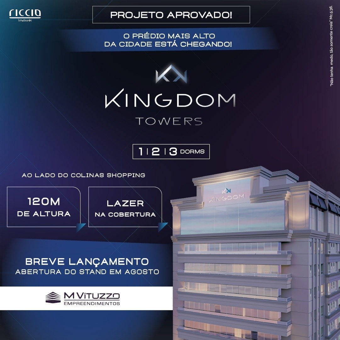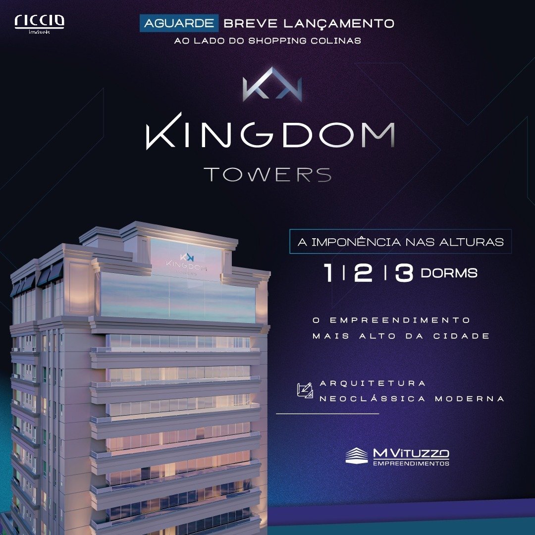 O Kingdom Towers esta localizado no bairro Jardim das Colinas em São José dos Campos e é composto por duas torres que contam com apartamentos de 1, 2 ou 3 dormitórios. Lançamento do M Vituzzo Kingdom Towers, o empreendimento mais alto da cidade. Comodidades: 1, 2 ou 3 Dormitórios, 2 ou 3 Vagas Cobertas, Hobby Box.O mais alto empreendimento da cidade, com lazer a mais de 100 metros de altura! Um dos maiores e mais completos complexos imobiliários do país, com acesso direto ao Colinas Shopping!